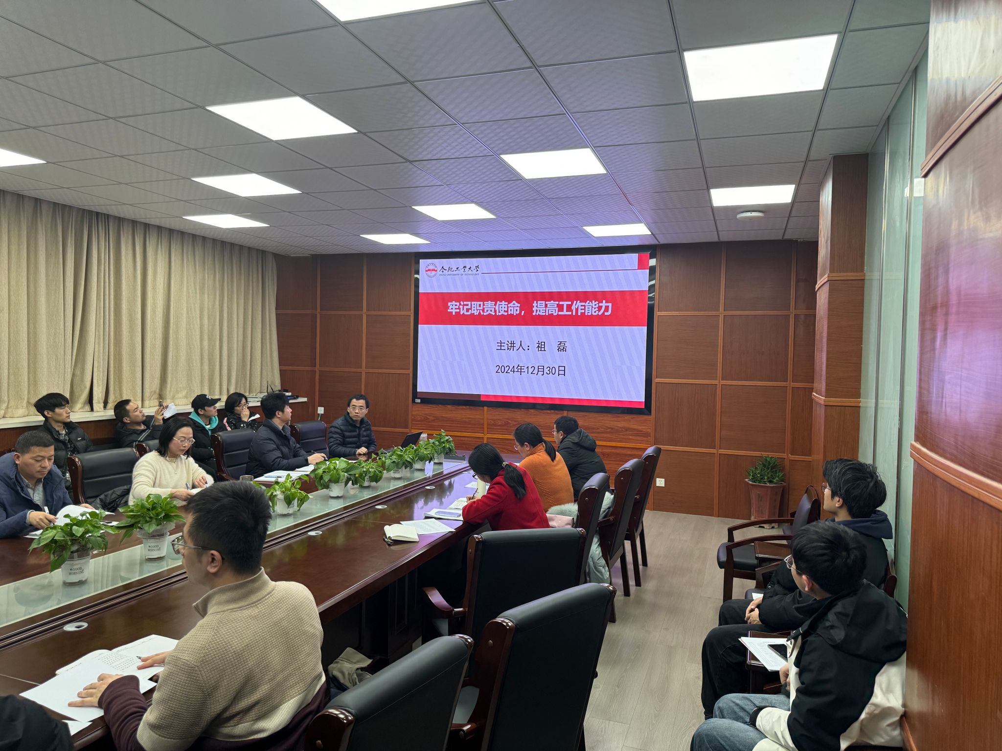 12月30日下午,MG冰球突破官网网站党委书记祖磊为师生党支部书记讲授党课,党课题目为“牢记职责使命 提高工作能力”,学院党委秘书、研究生辅导员和28个基层党支部书记参加了党课学习。